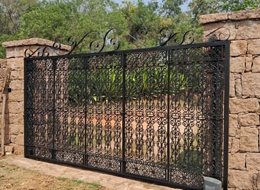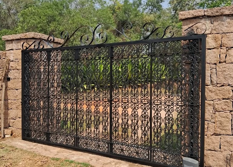 Portão em ferro com acabamento rústico e detalhes artesanais.